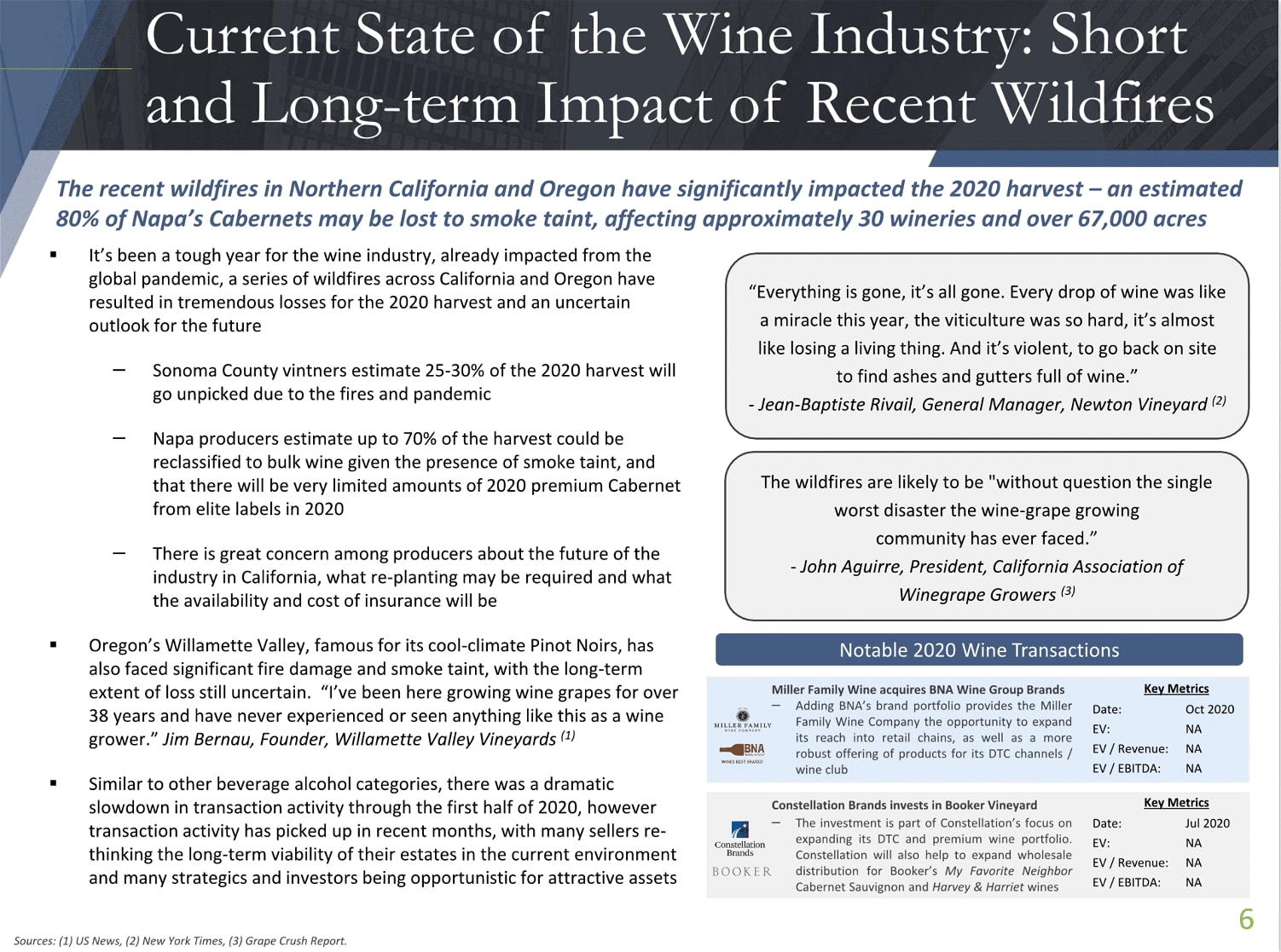 The 2020 Glass fire claimed 31 wineries and the 2017 fires destroyed over 6 wineries that are still trying to recover. The Napa Valley Vintners, Napa Valley Grapegrowers and Winegrowers of Napa County estimated that just the 2020 Glass Fire will result in $1 billion in losses to wineries and $50 million in lost wages.